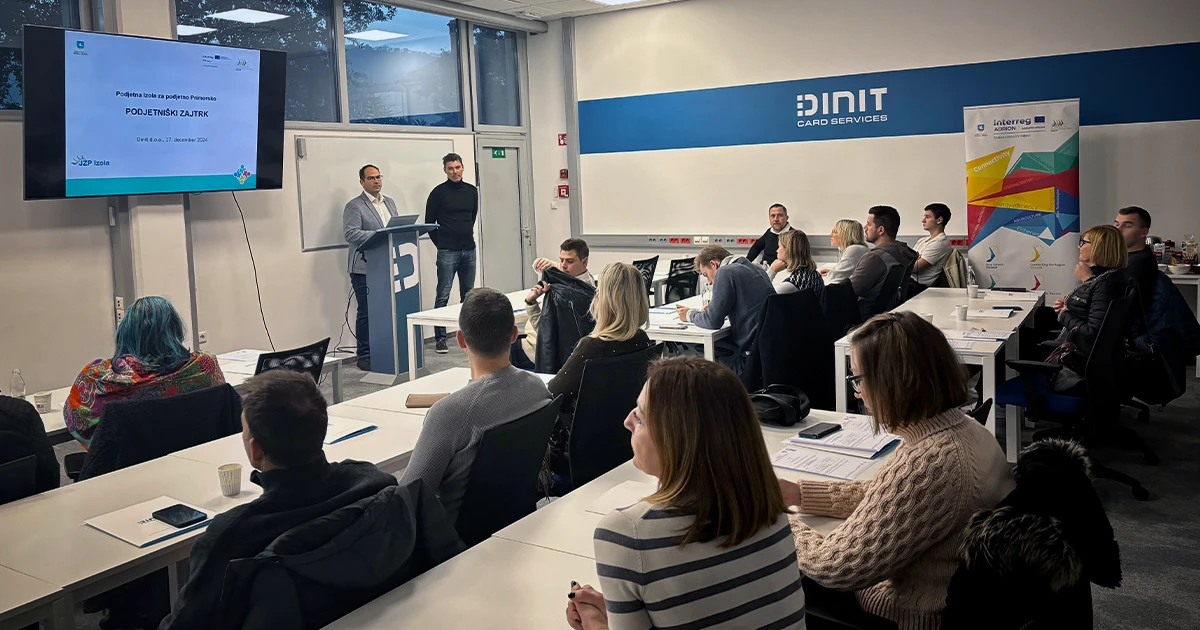 Dinit Card Services was proud to once again support the “Eno morje idej 2025” entrepreneurship competition, organized by JZP Izola, as its Golden Sponsor. This year’s finalists showcased remarkable creativity, courage, and ambition within our community, qualities that strongly resonate with the work we do at Dinit.